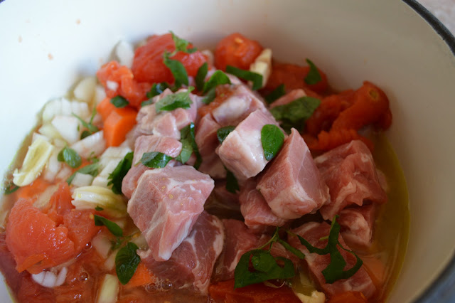 - Put the first 9 ingredients in a small casserole with a lid. Stir it all up and season well.