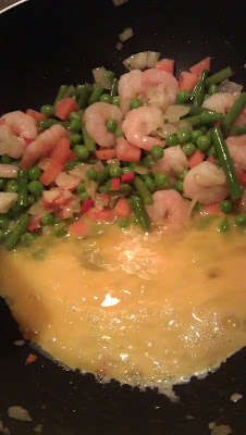 - Crack in two eggs and scramble them in pan. Allow to set and then stir in with the rest of the vegetables.